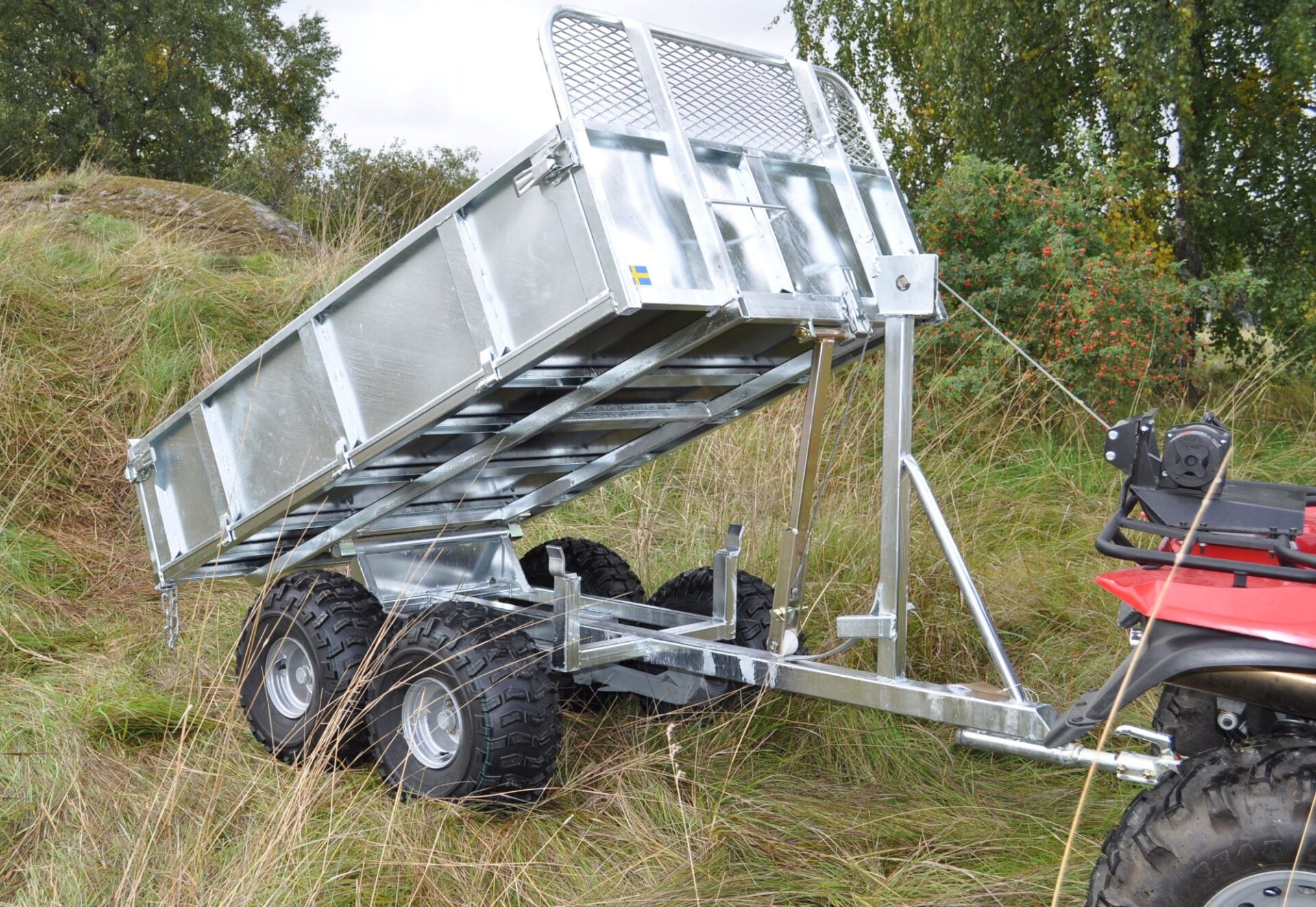 Tippkärran lämpar sig utmärkt för arbete i exempelvis parker, trädgårdar och områden med dålig bärighet, men fungerar även mycket bra vid utfodring. Tippfunktionen manövreras genom att koppla en bakmonterad vinsch på fyrhjulingen till kärran, vilket ger en enkel och pålitlig lösning utan behov av separat hydraulik.